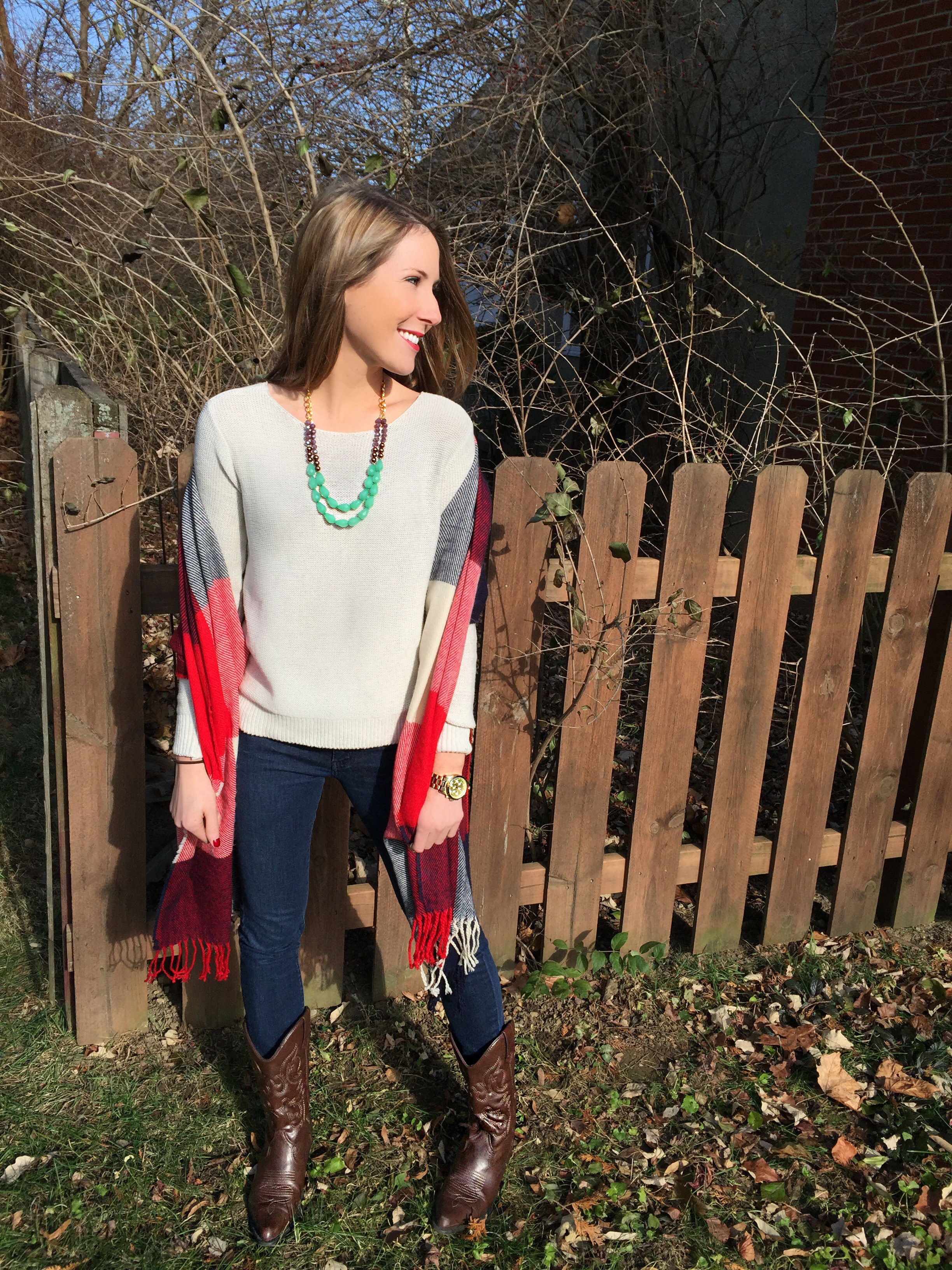 Necklace: Jewelry By Andie B. | Sweater: Forever 21 | Scarf: Forever 21 | Jeans: Koral Denim | Boots: Steve Madden