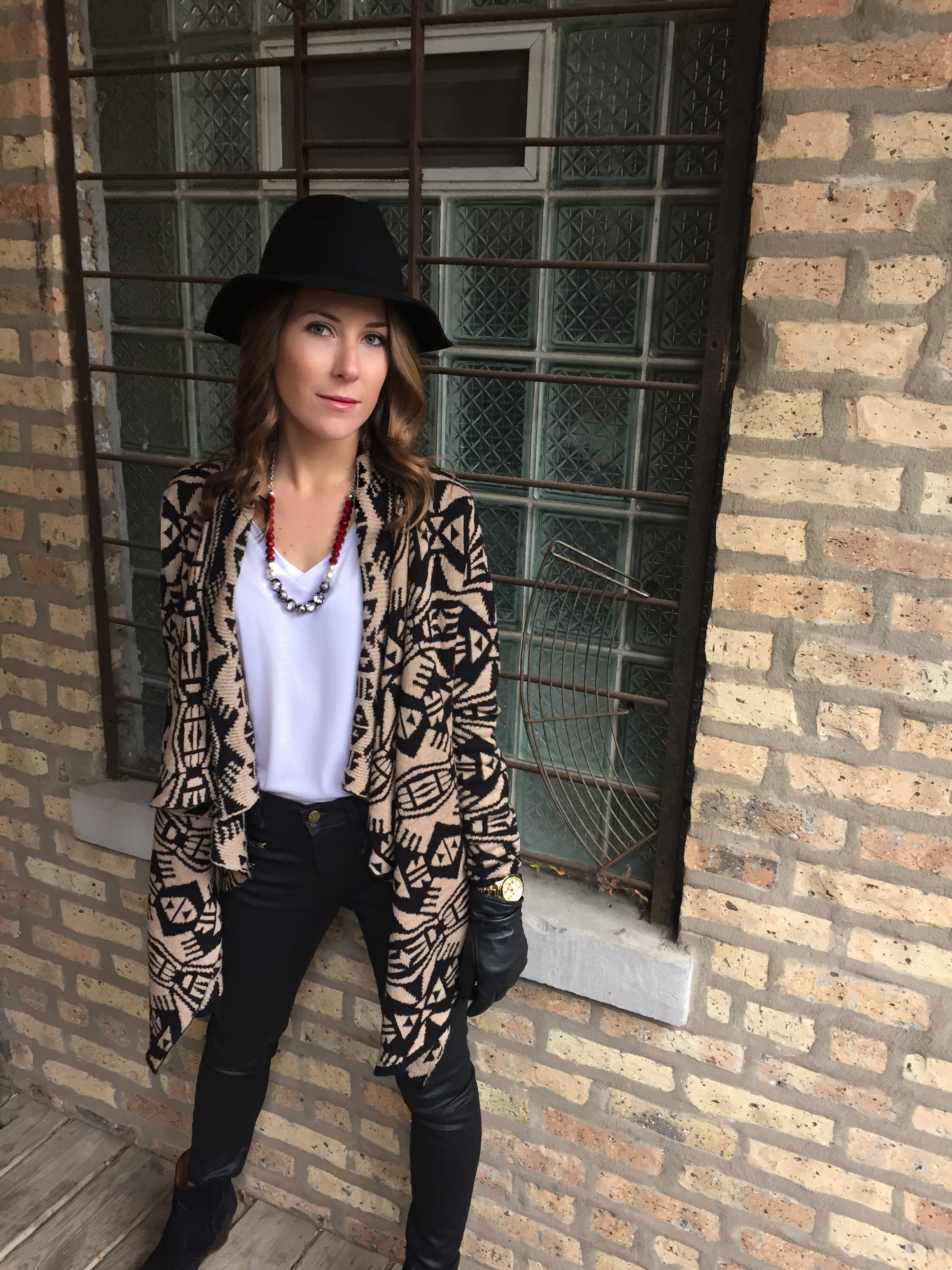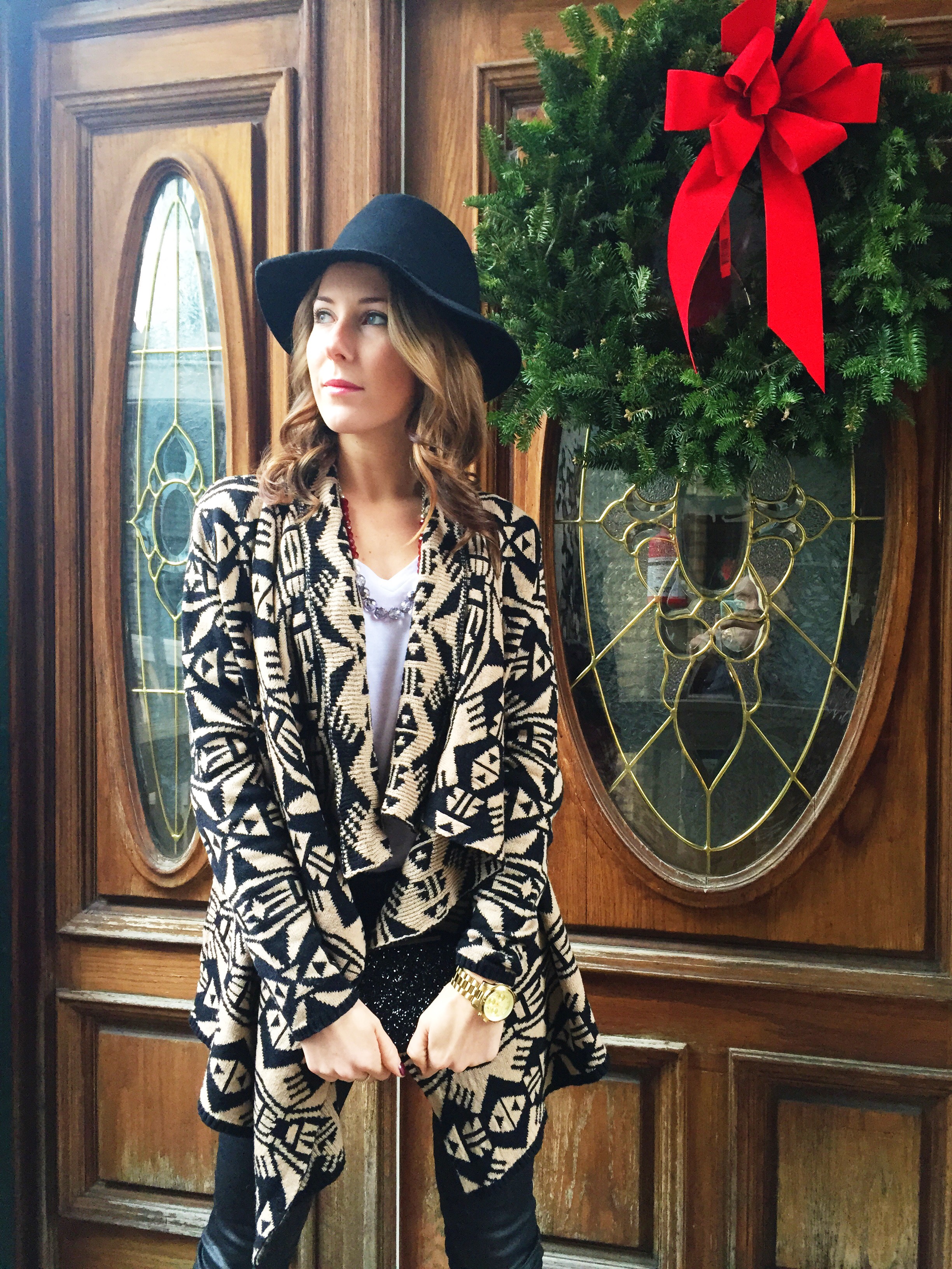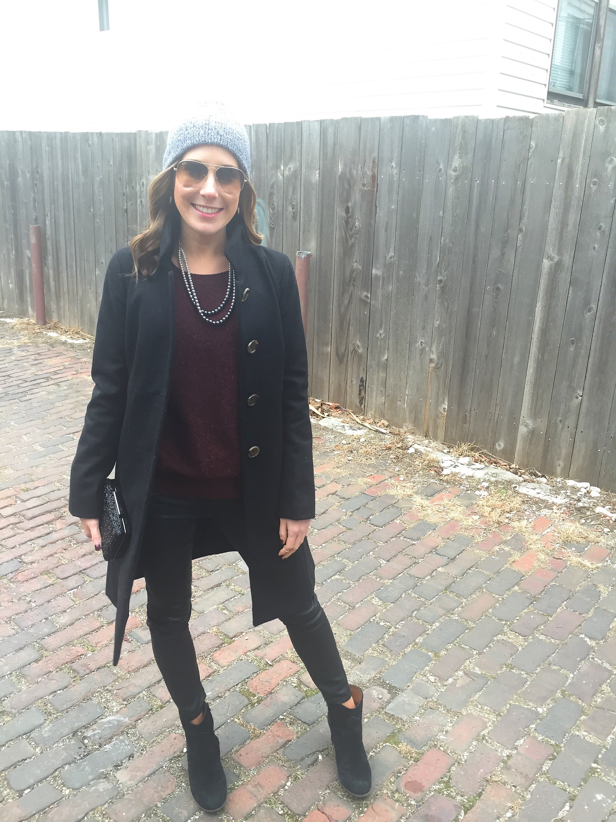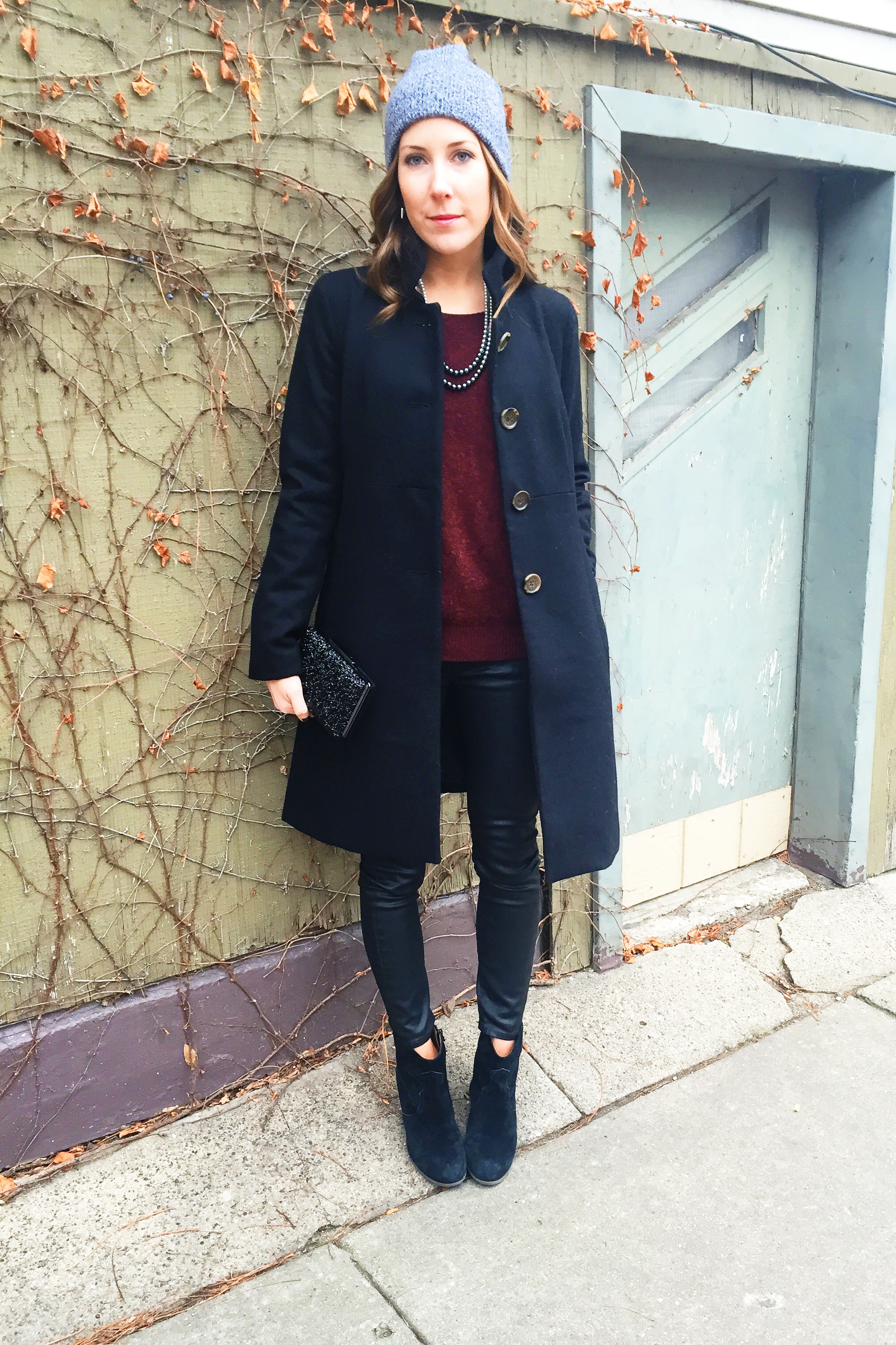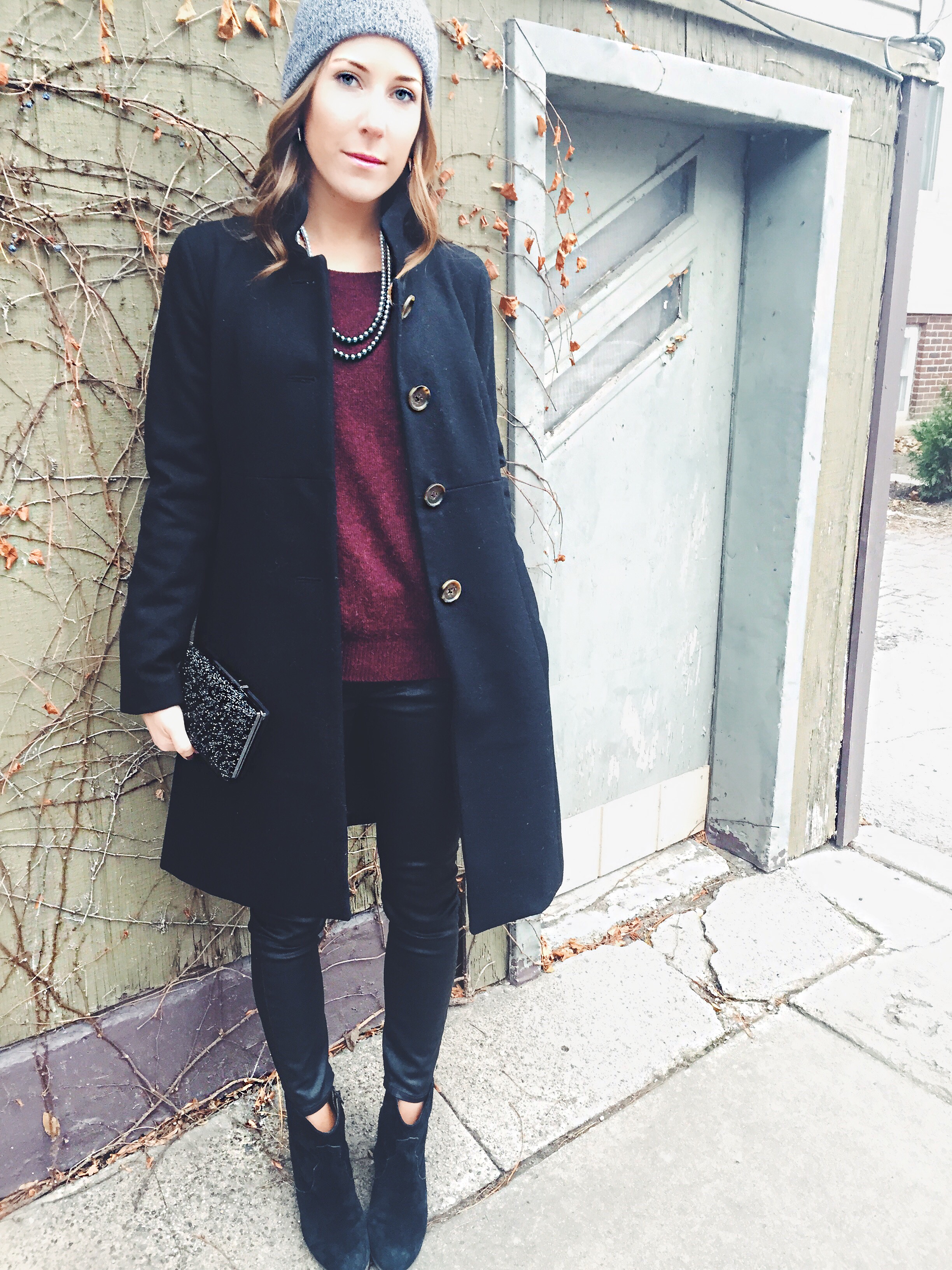 Necklace: Jewelry By Andie B. on Etsy | Spike Earrings: Jewelry By Andie B. on Etsy | Sweater: Forever 21 | Leather Denim: J. Crew (on sale!) | T-Shirt: Nordstrom | Hat: Forever 21 | Watch: Michael Kors | Glittery Clutch: TJ Maxx | Leather Gloves: Last Year’s Christmas Gift from Macy’s | Booties: Lucky Brand