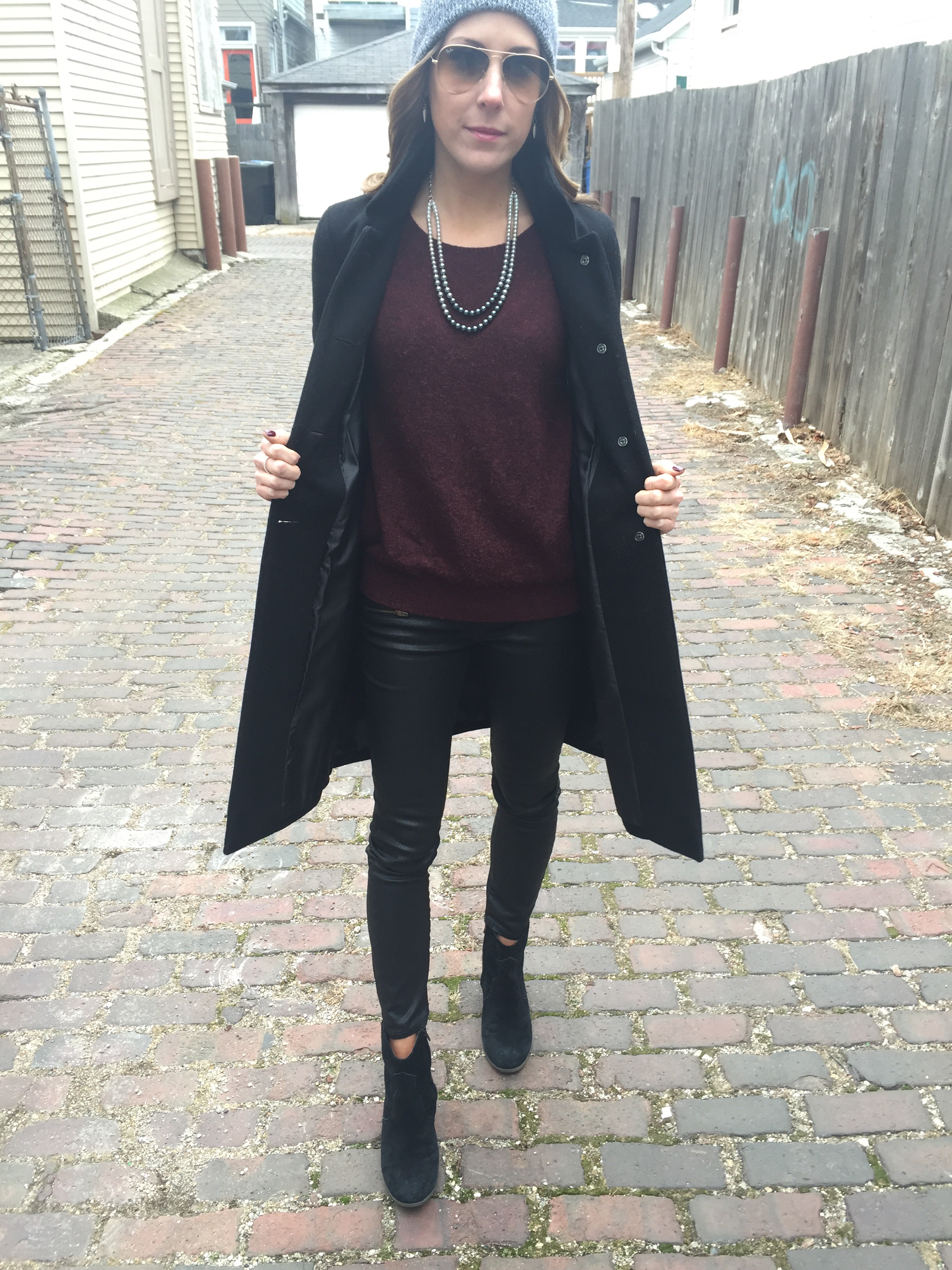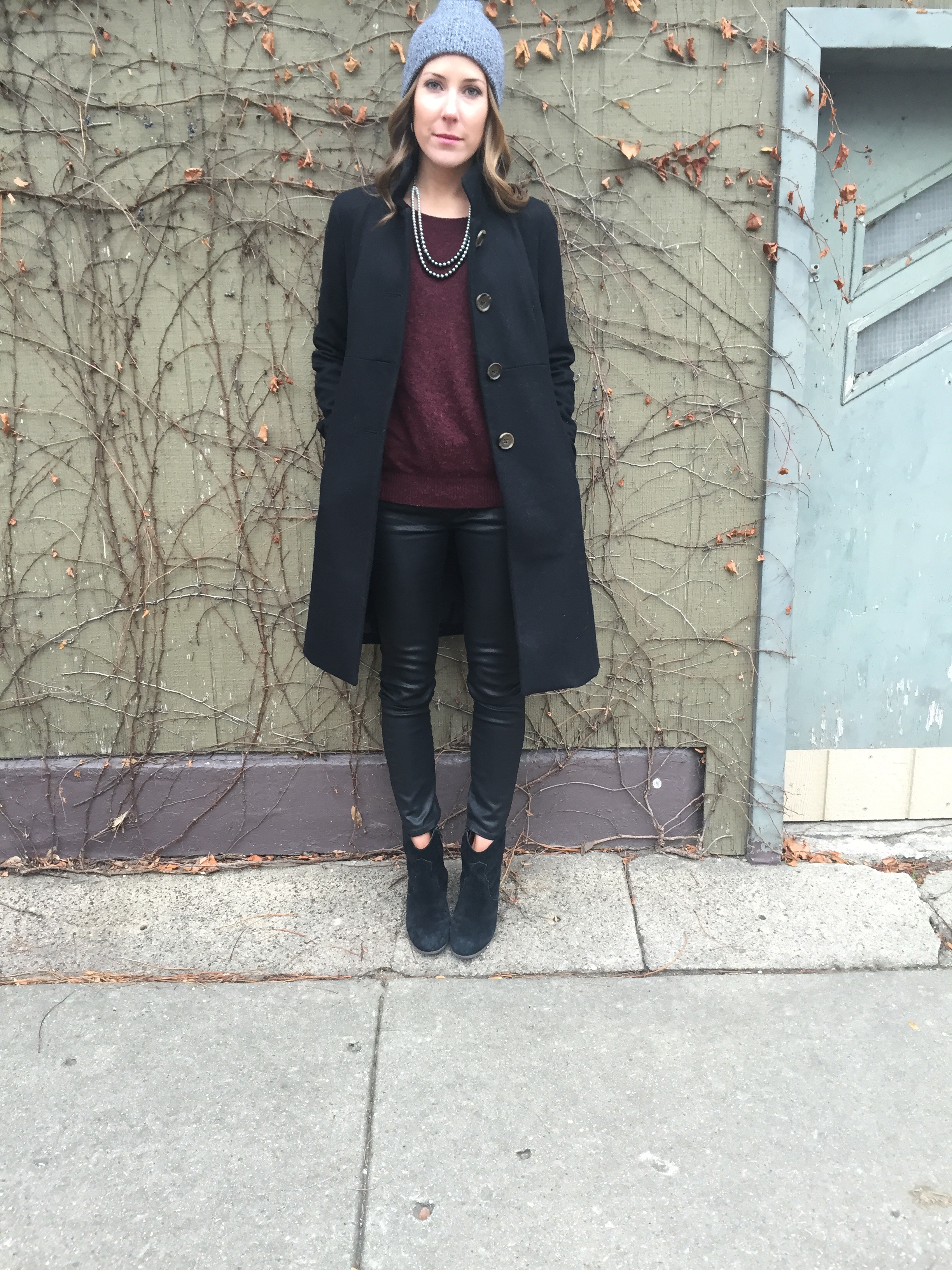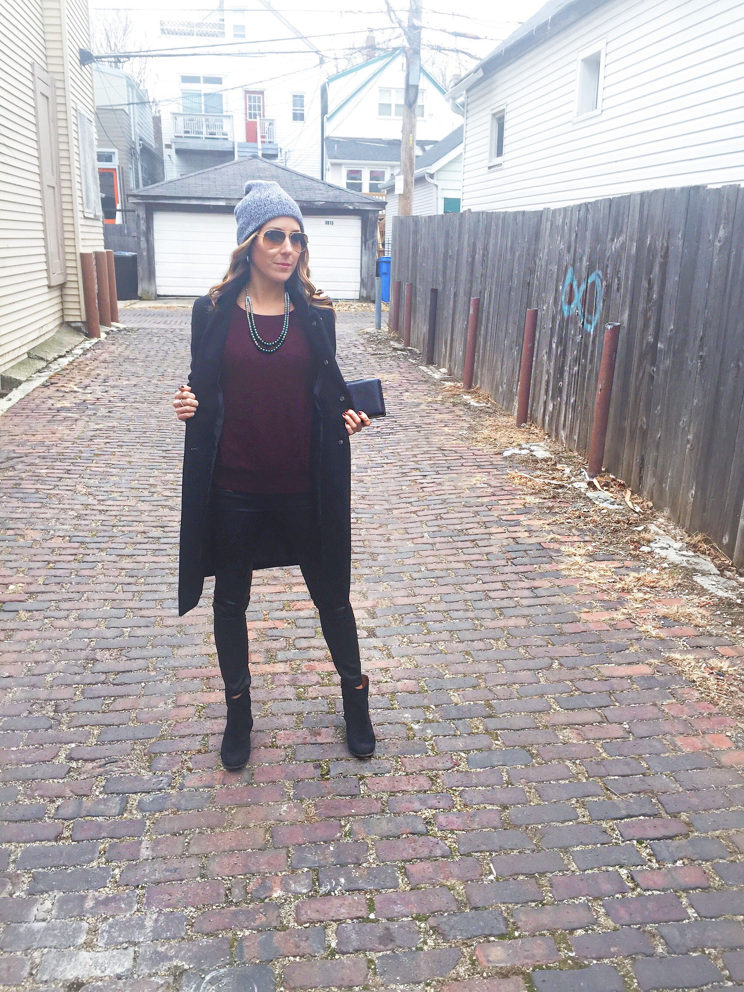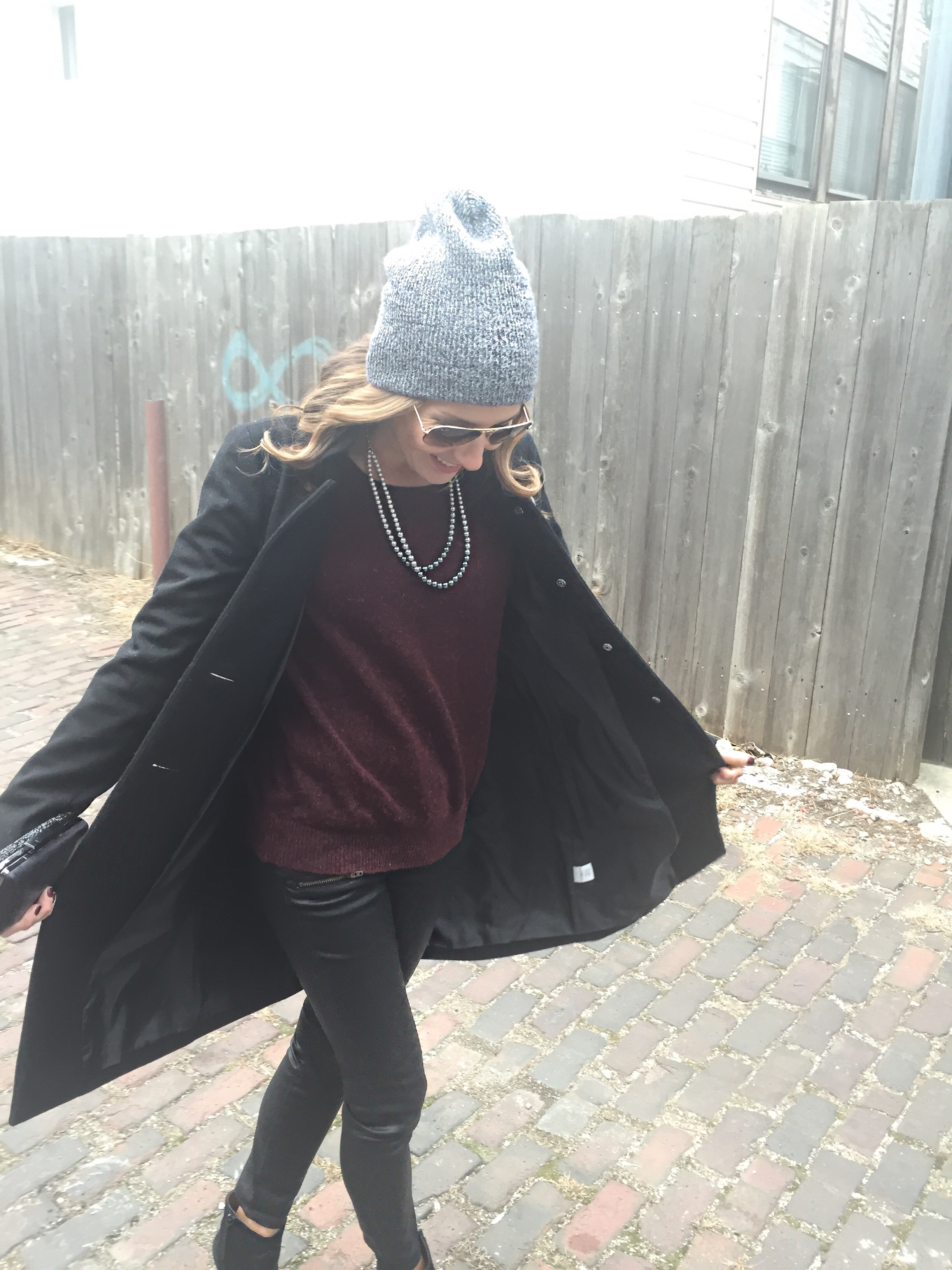 Necklace: Jewelry By Andie B. on Etsy | Earrings: Jewelry By Andie B. on Etsy | Jacket: J. Crew | Sweater: Forever 21 | Leather Denim: J. Crew | Booties: Lucky Brand | Beanie: Urban Outfitters | Clutch: TJ Maxx (similar to this) | Sunnies: Ray Band (similar to these) | Watch: Michael Kors