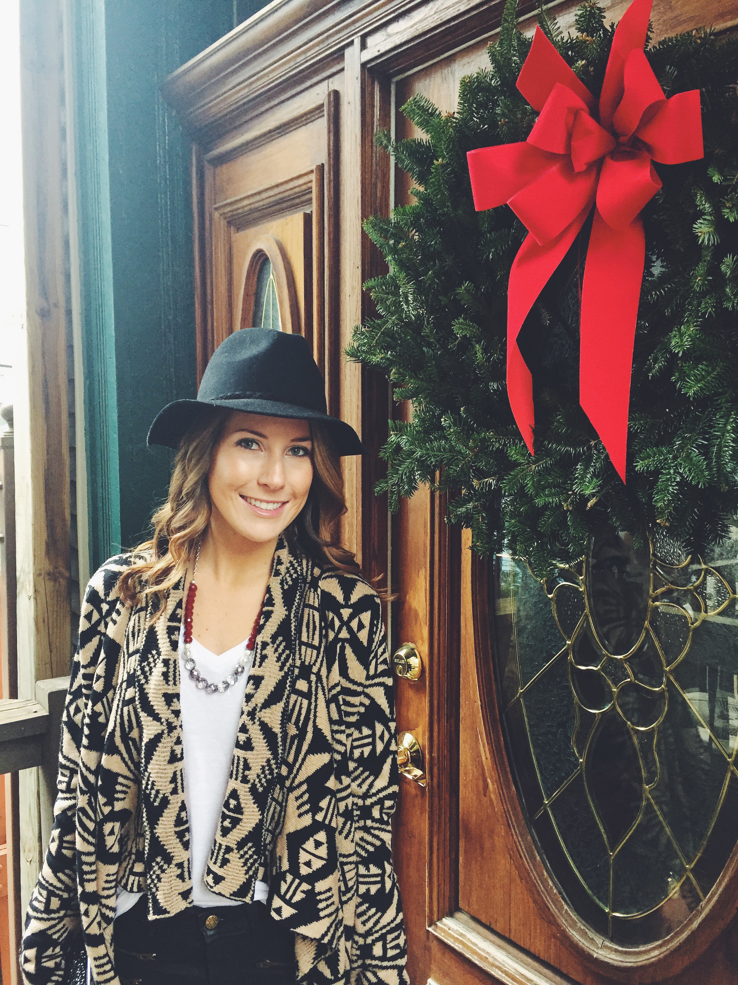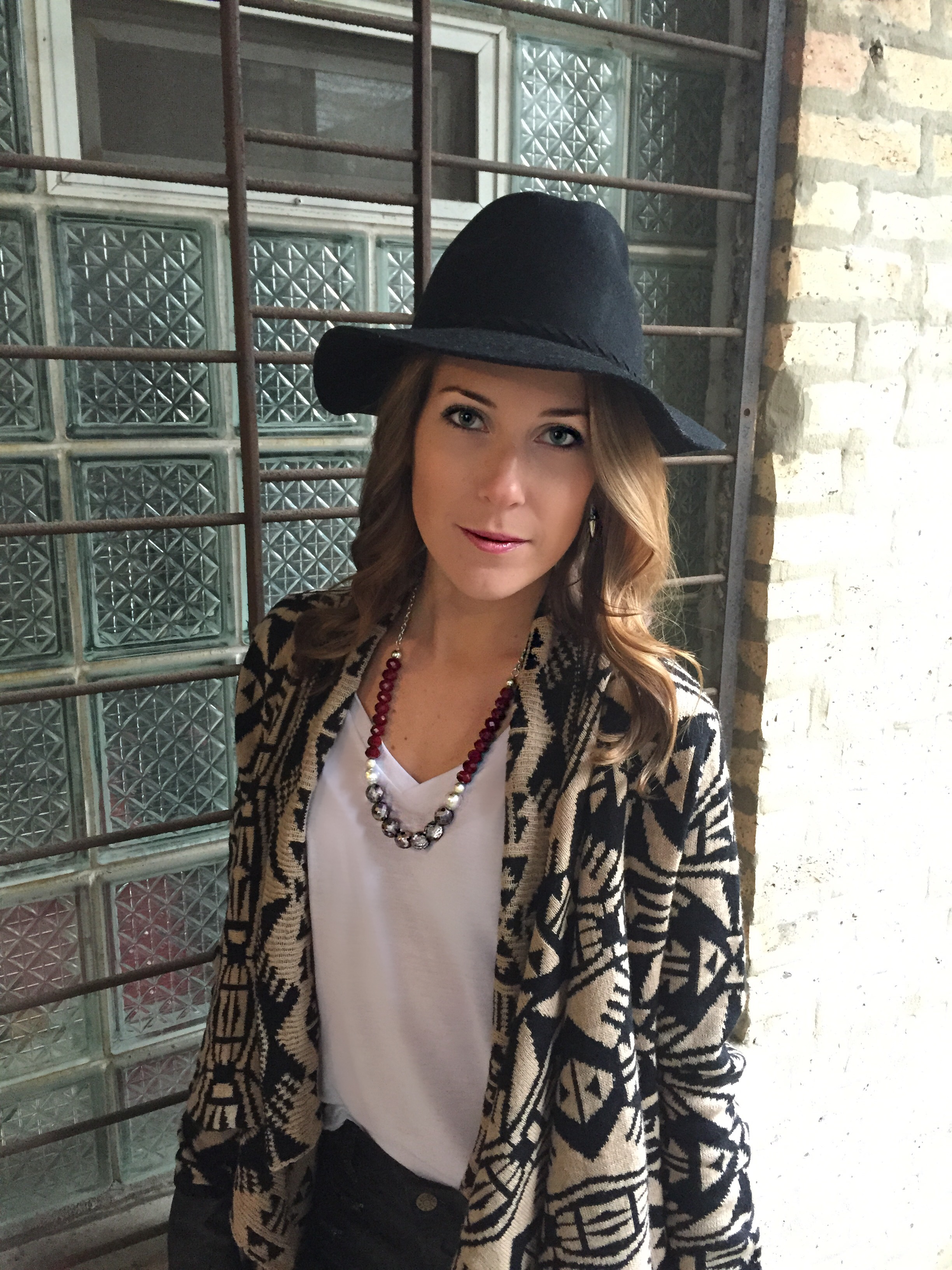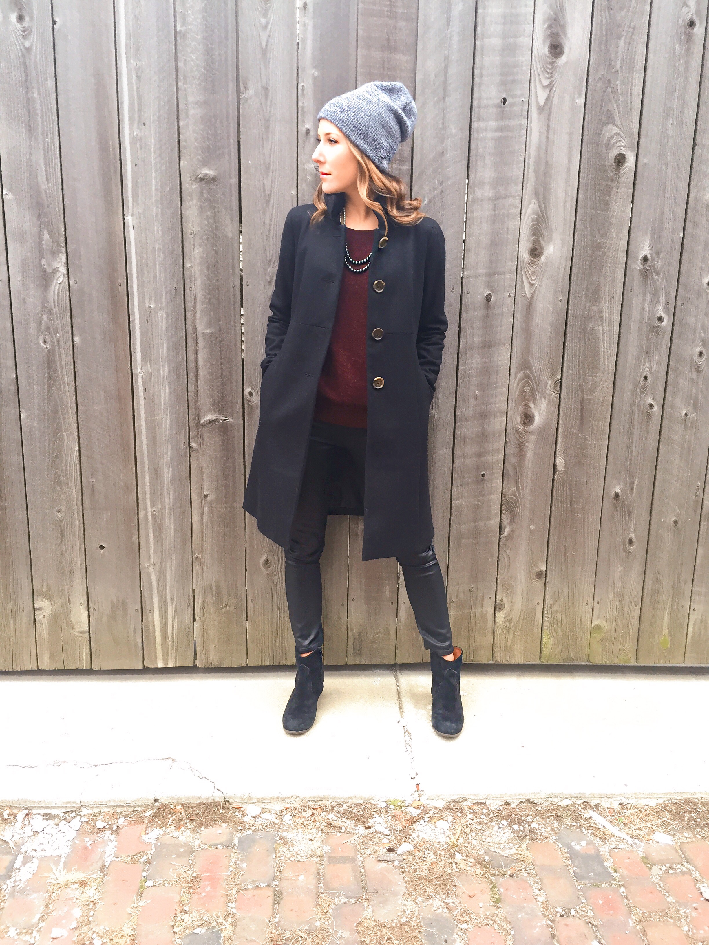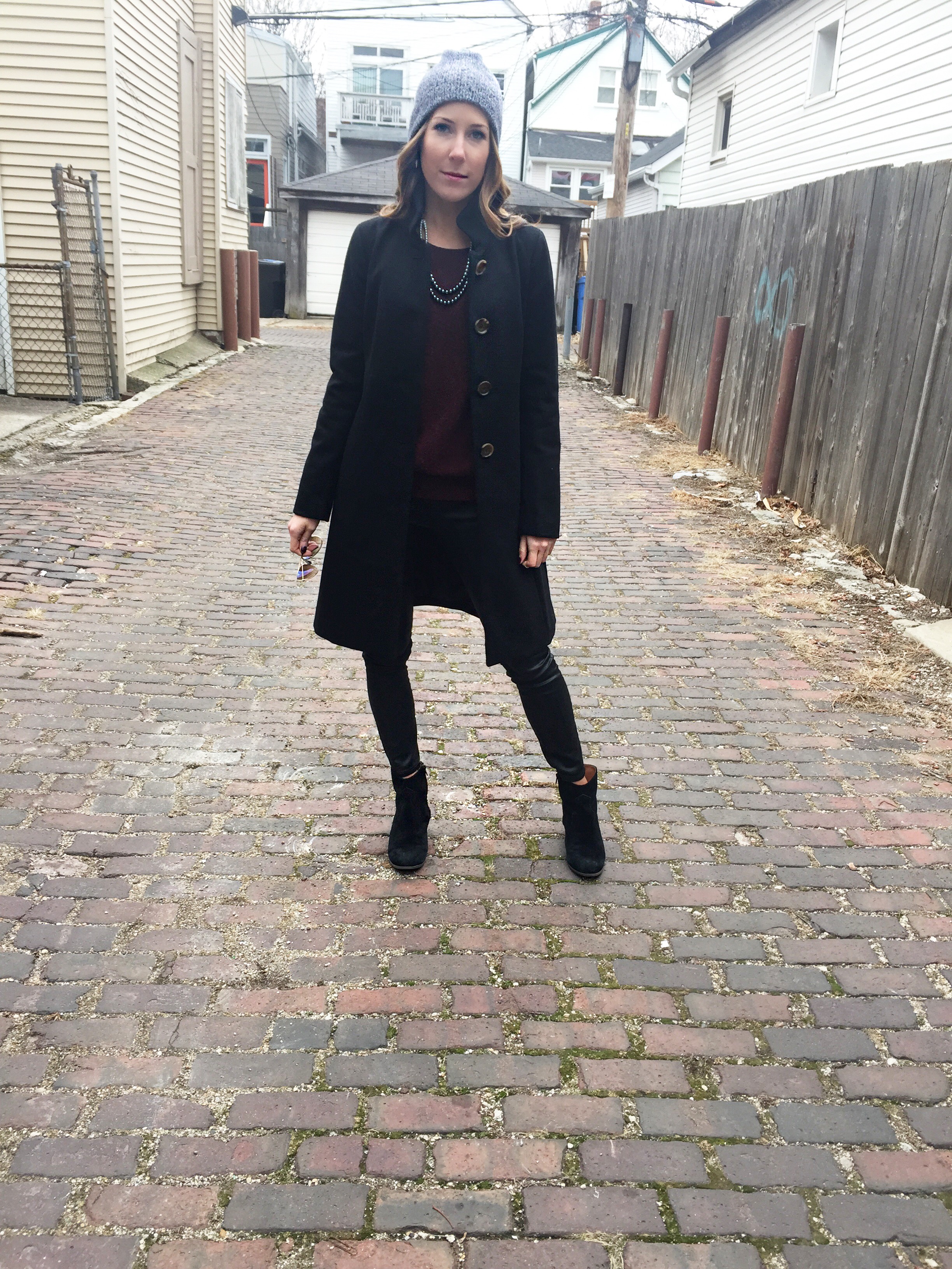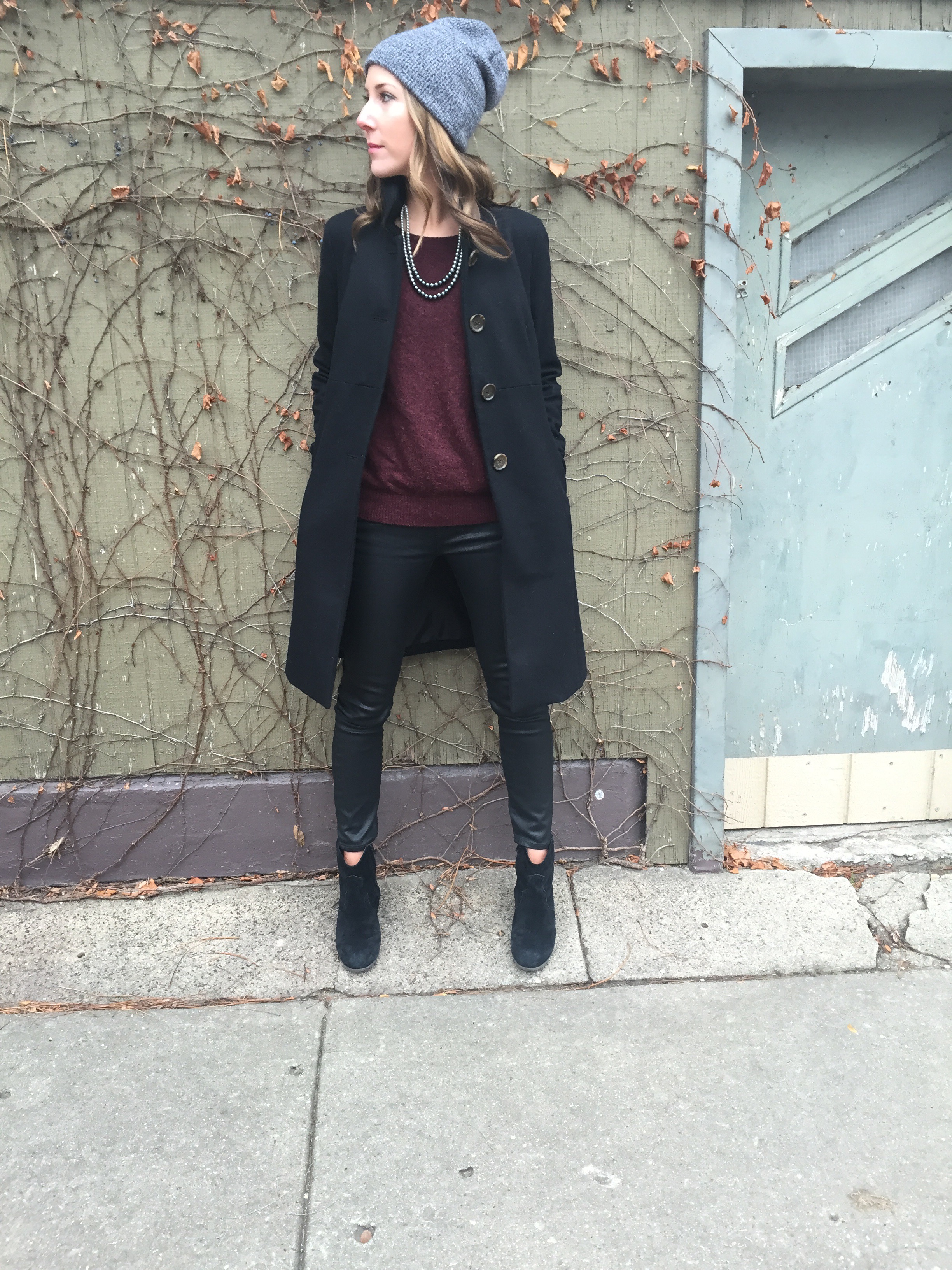 Necklace: Jewelry By Andie B. on Etsy | Earrings: Jewelry By Andie B. on Etsy | Jacket: J. Crew | Sweater: Forever 21 | Leather Denim: J. Crew | Booties: Lucky Brand | Beanie: Urban Outfitters | Clutch: TJ Maxx (similar to this) | Sunnies: Ray Band (similar to these) | Watch: Michael Kors