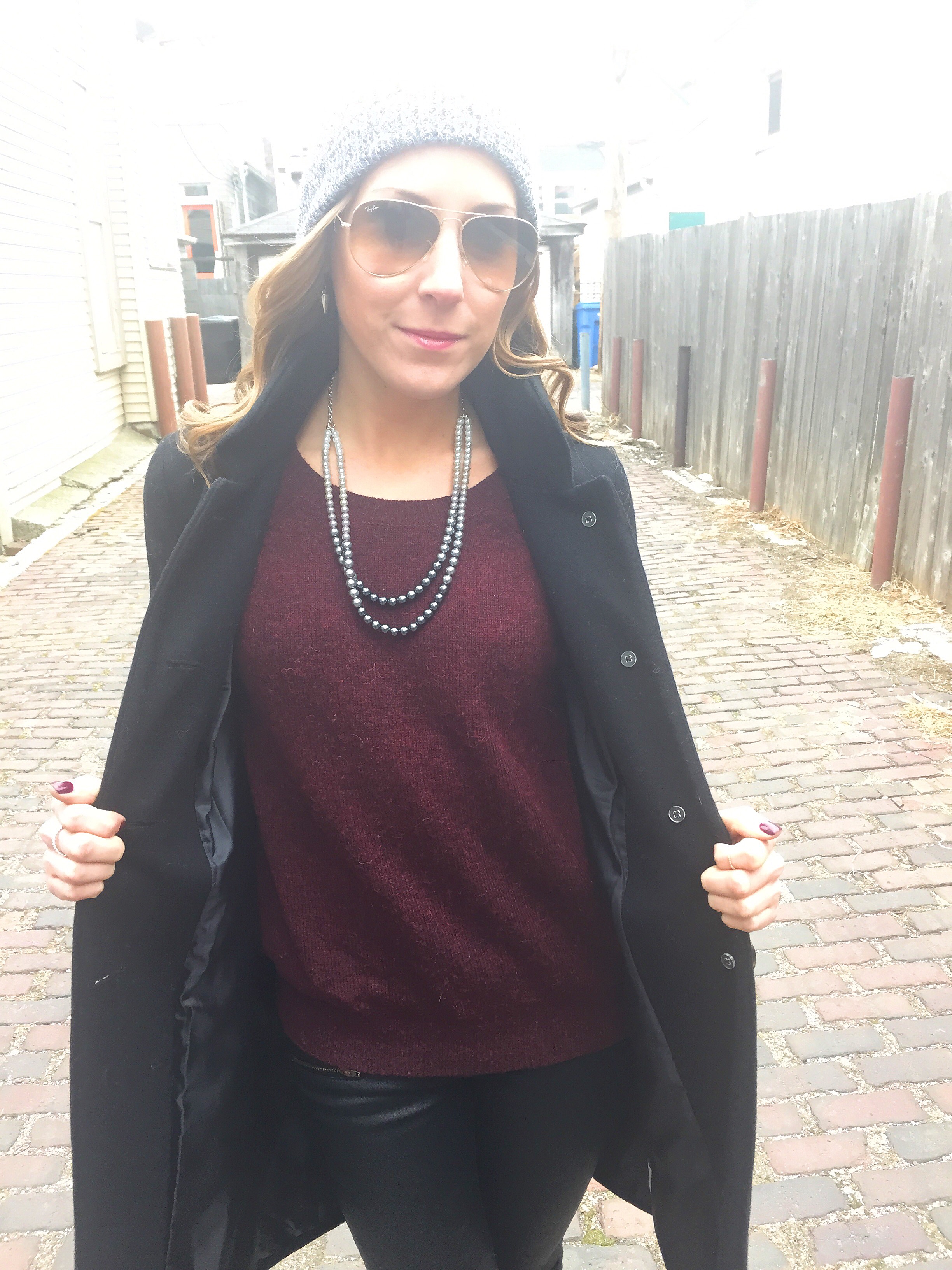 I made the above Grey and Silver Ombre Statement Necklace using glass pearls in different shades of grey and whites.  PBS and I took photos on the dreariest of Sundays, but I think these photos actually turned out very mysterious looking.  The pop of color from my maroon sweater and the shimmer from my grey pearl necklace adds a glimmer of positivity and longing.  I love mixing edgy pieces with softer pieces to give a dynamic look.  I think the pearl necklace and glittered clutch add a touch of softness to the harsh lines of the black peacoat and black leather pants.  The sharp Silver Metal Spiked Stud Earrings are small and discrete, but add a touch of power to the outfit.  Unfortunately, this necklace was sold.  However, if you absolutely love it and have to have it, email me and I’ll be happy to commission another for you!  The earrings are still available on my Etsy shop!